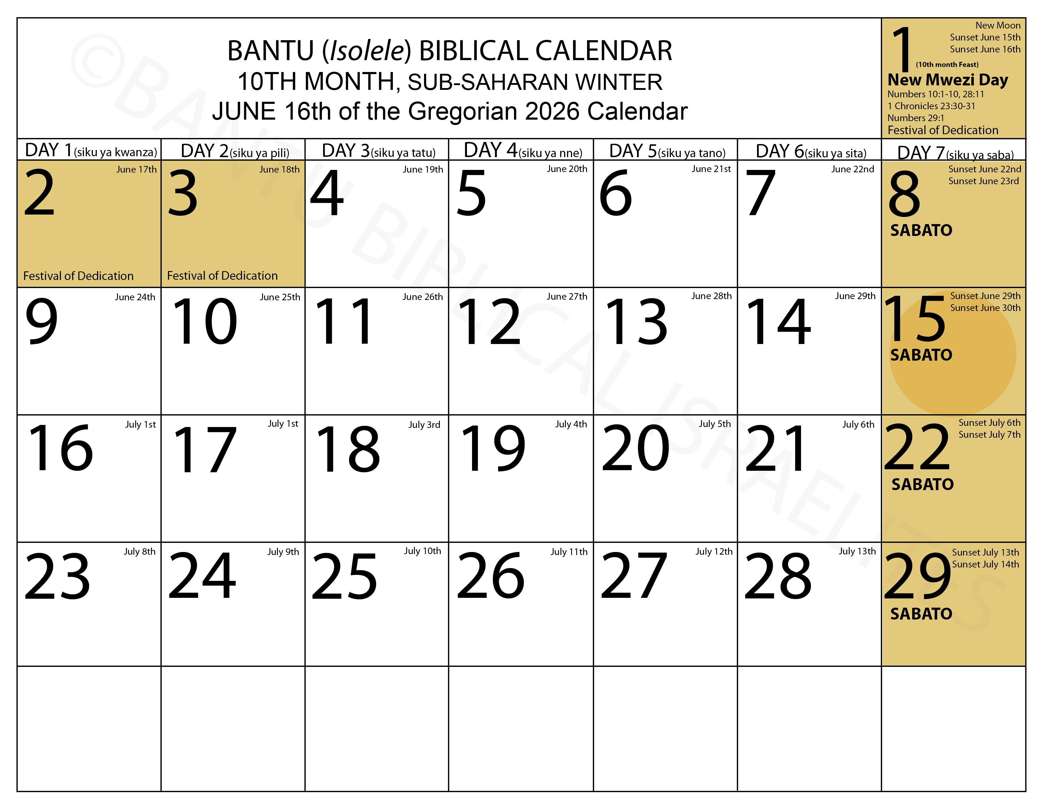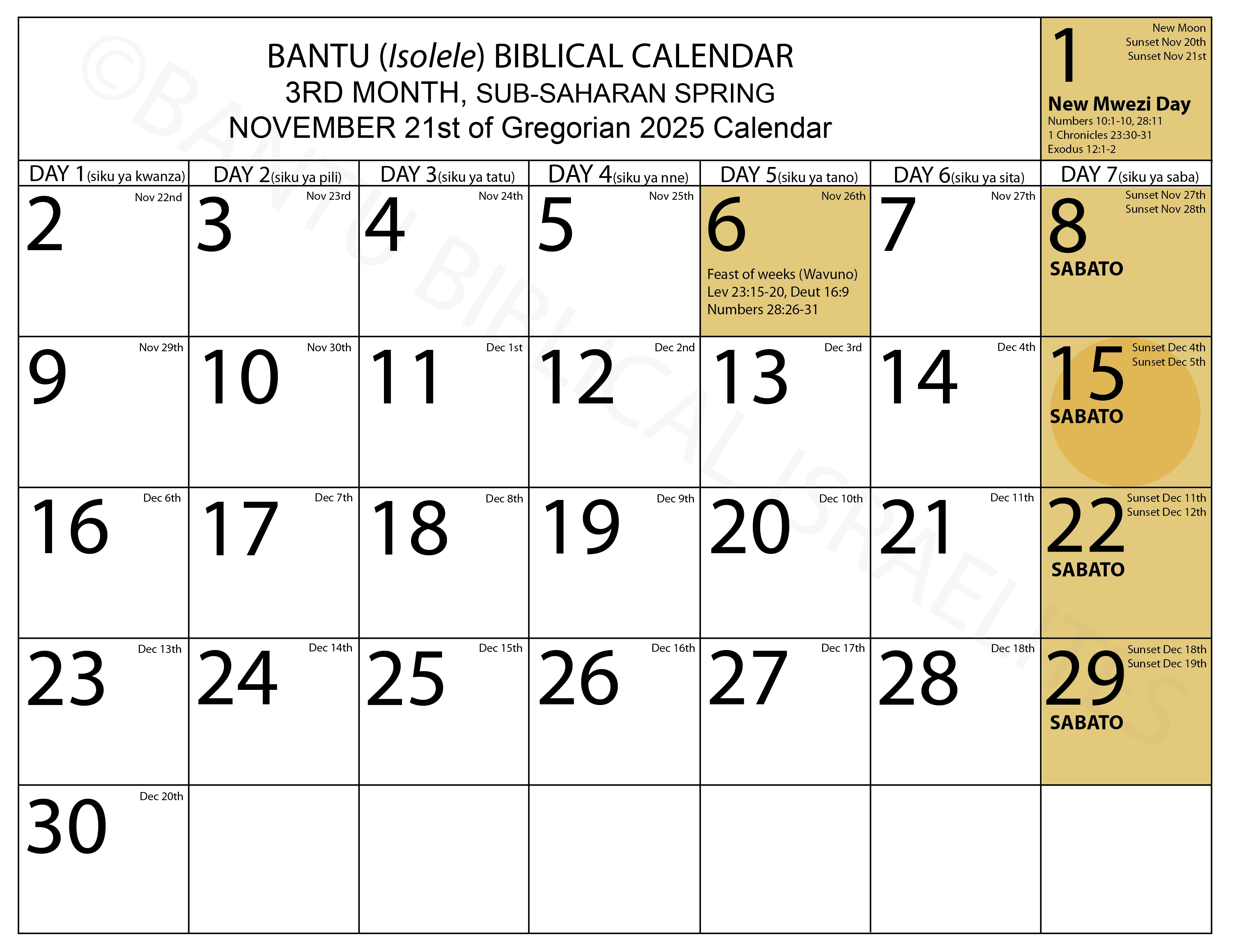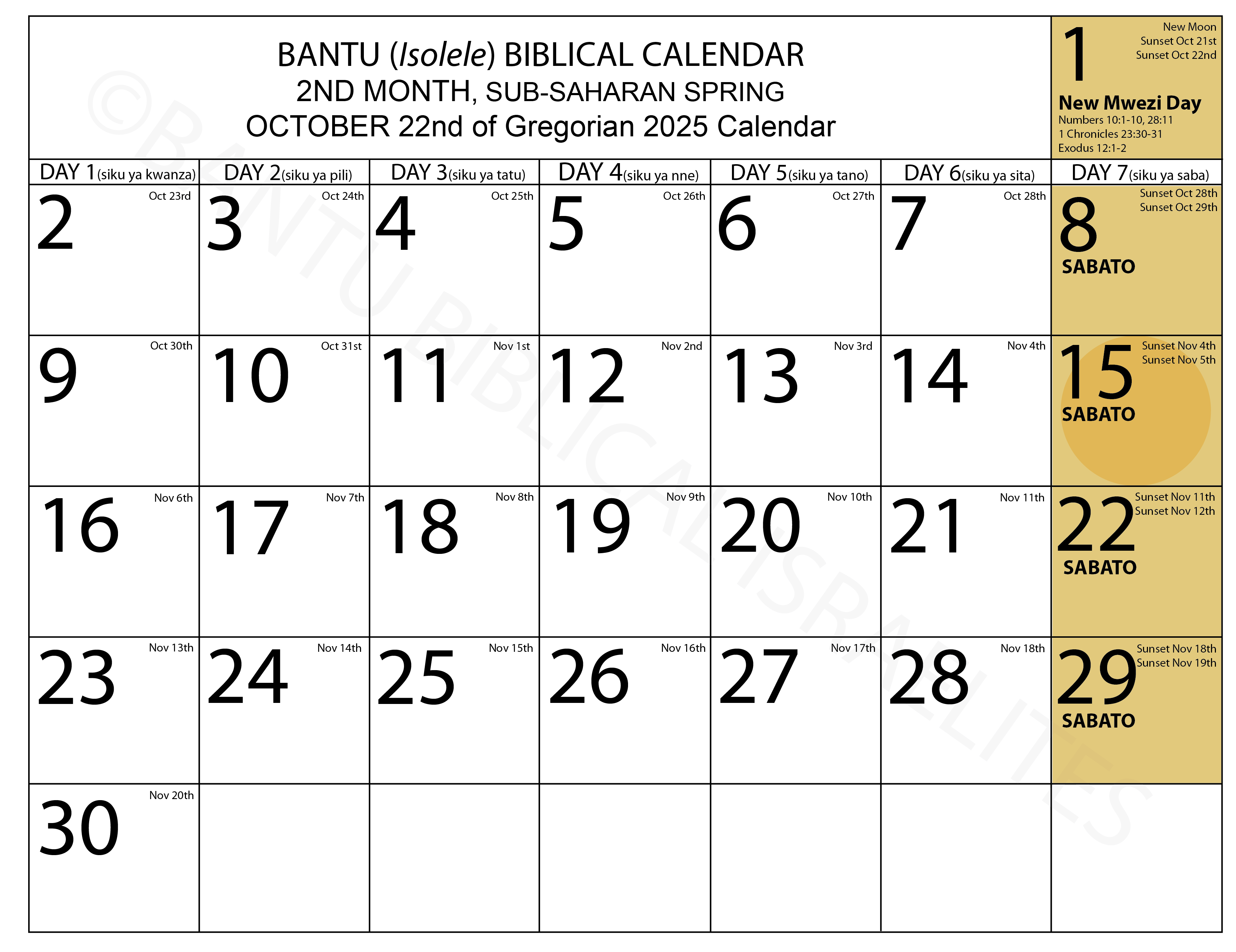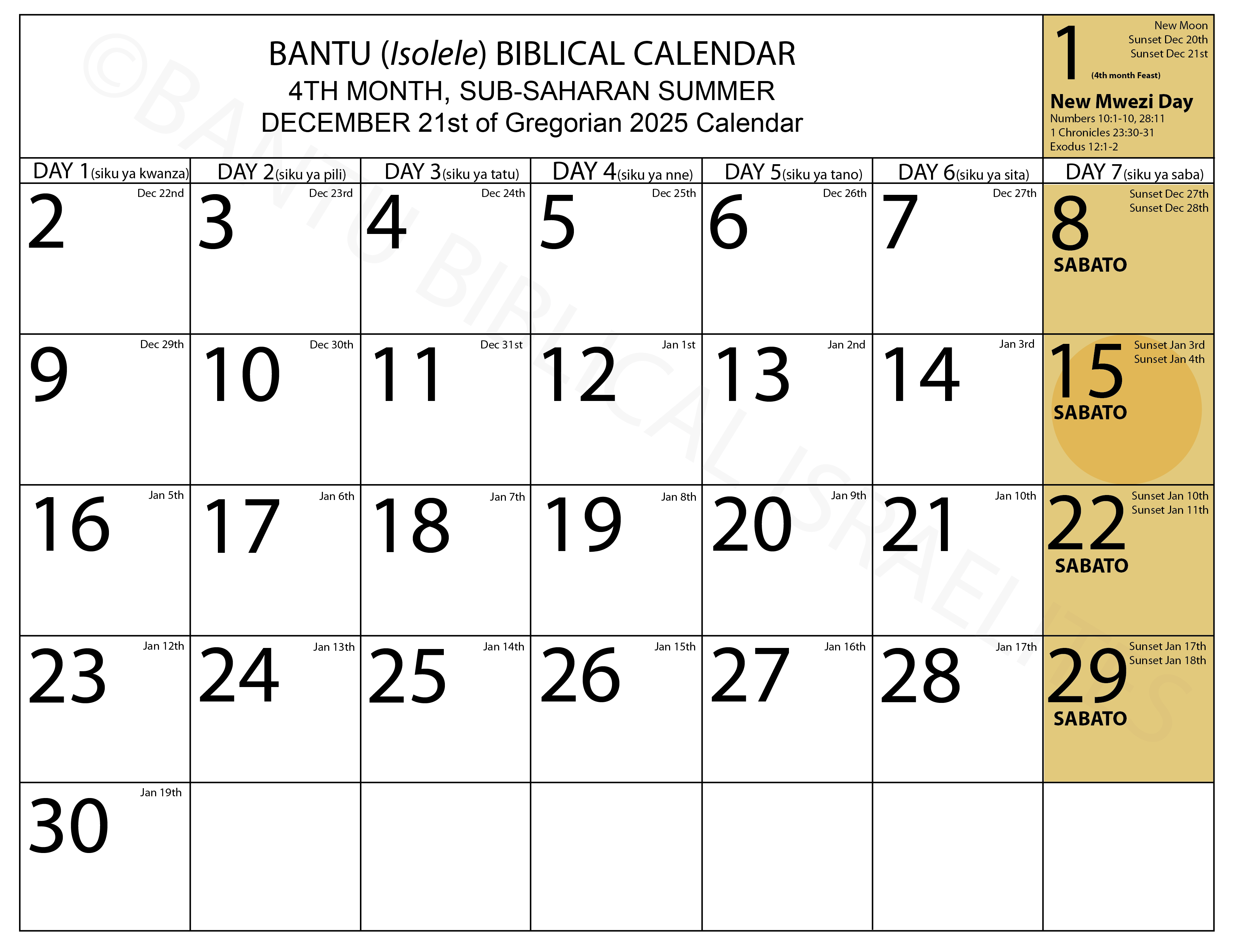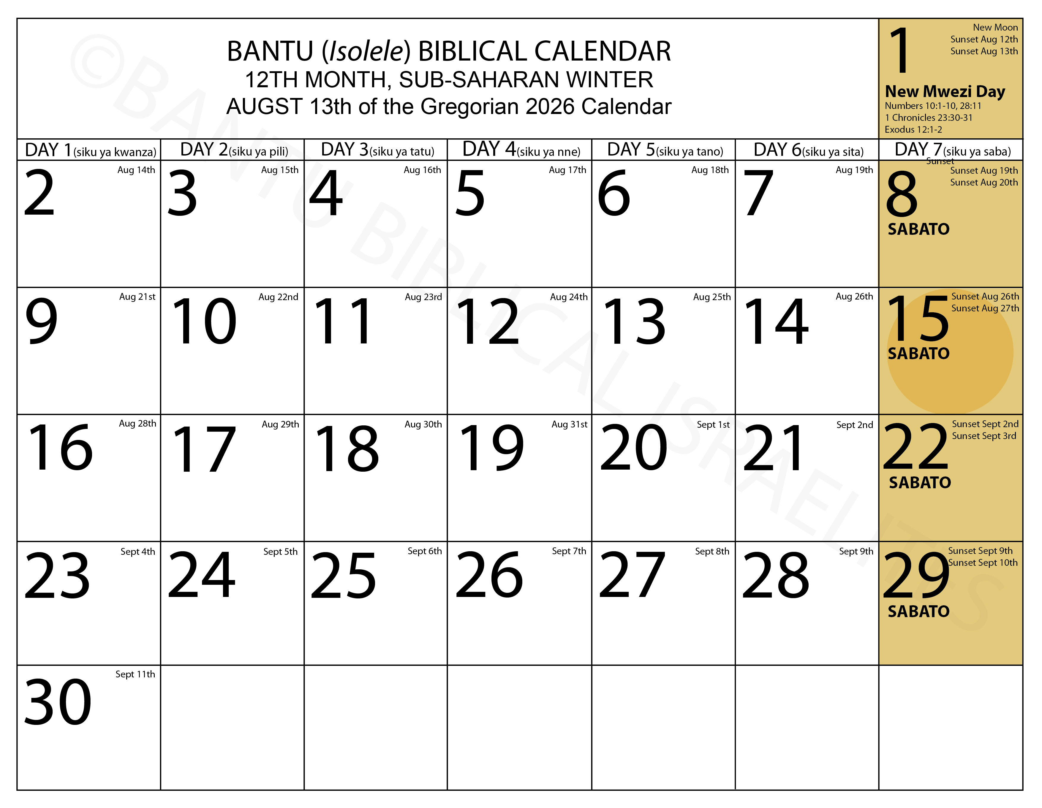 It is my hope that this calendar will serve as a guide for us all, enabling us to observe the Sabbath as it is commanded in the Scriptures, and to faithfully keep the biblical festivals ordained by the Most High, rather than the pagan feasts into which we were misled—feasts that directly oppose the divine order of creation. Through the Spirit of the Most High, I have labored for years—observing both the lunar and solar cycles, revisiting geography and history, exploring our ancestral languages, and studying Bantu customs. This has required prayer, sacrifice of time and energy, private debates within the awakening community, and the continual revisiting of the Scriptures. Out of this long and careful process, guided by wisdom from above, something concrete has emerged. Yet, despite the effort invested, I encourage each of you to pursue your own study, carefully examining the biblical references and historical sources provided. If you have questions, please do not hesitate to reach out, for this is still a work in progress and we do not claim to have all the answers. If you would like to begin with this foundation and need a free PDF copy, feel free to inbox us.